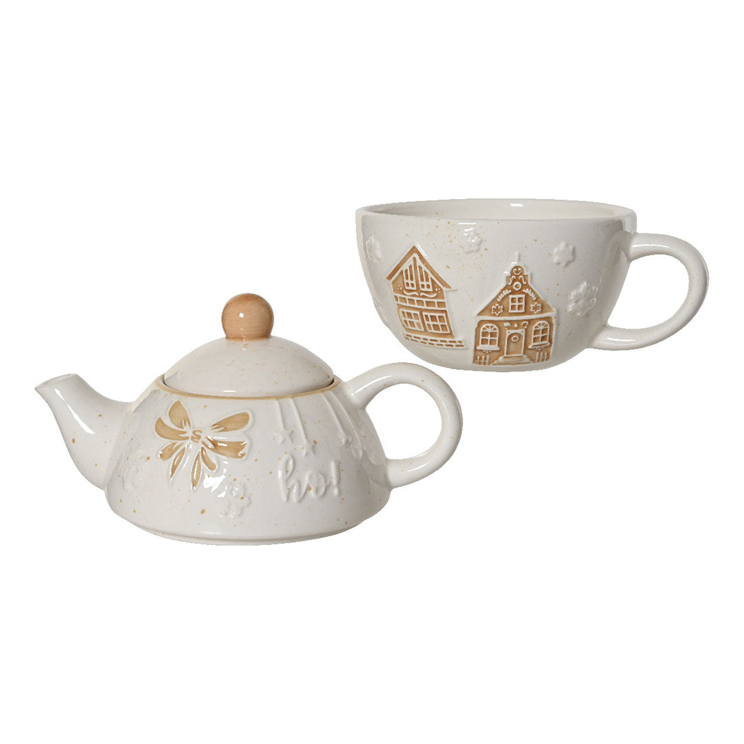 teiera e tazza bianca con decorazione in rilievo tema biscotto