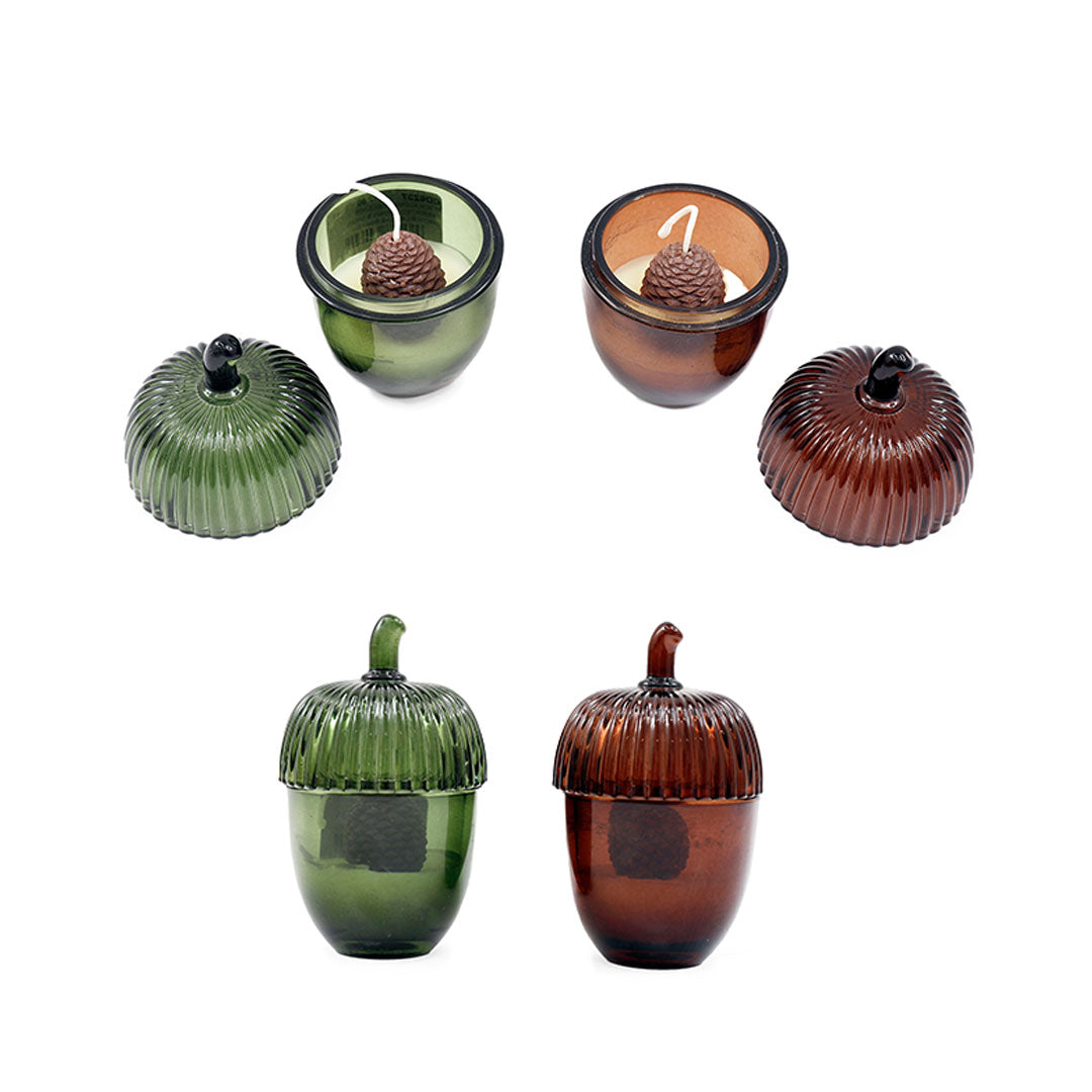 candelina in paraffina a forma di pigna dentro un cofanetto in vetro a forma di ghianda