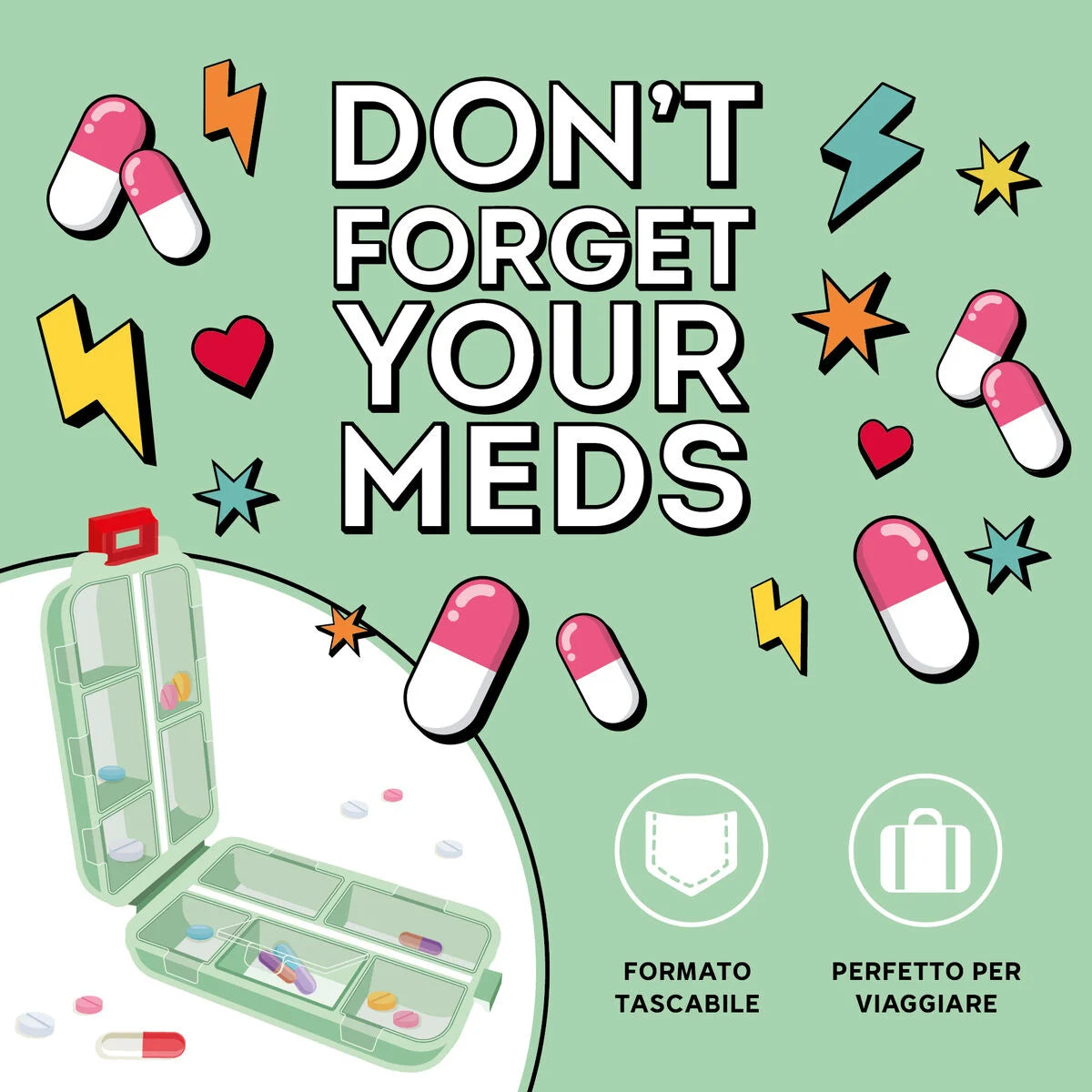 organizza le tue pastiglie negli scomparti e infilalo in borsa, nel comodino o in valigia.
