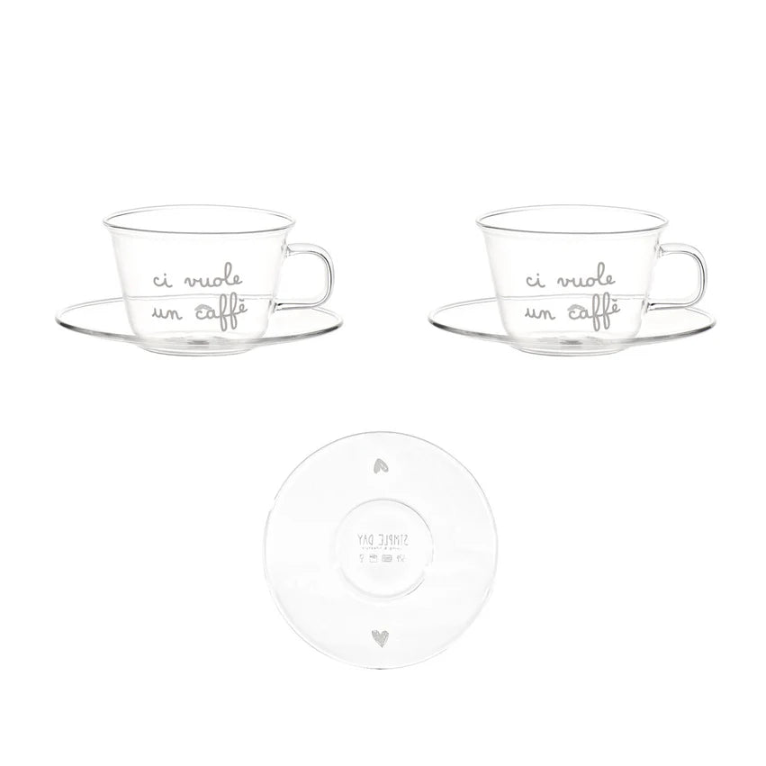 Set 2 tazzine espresso in vetro borosilicato decoro Ci vuole un caffè con piattino