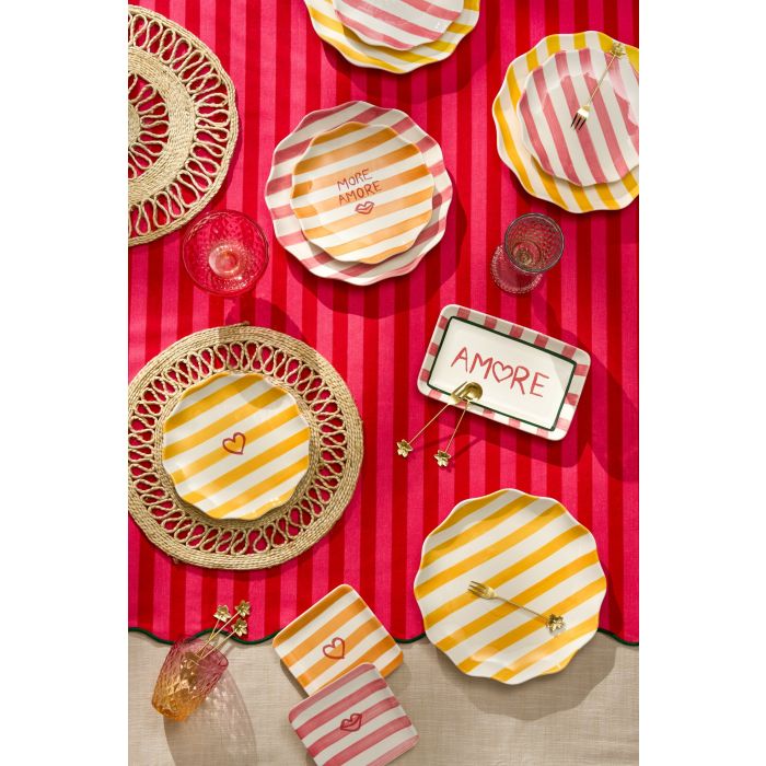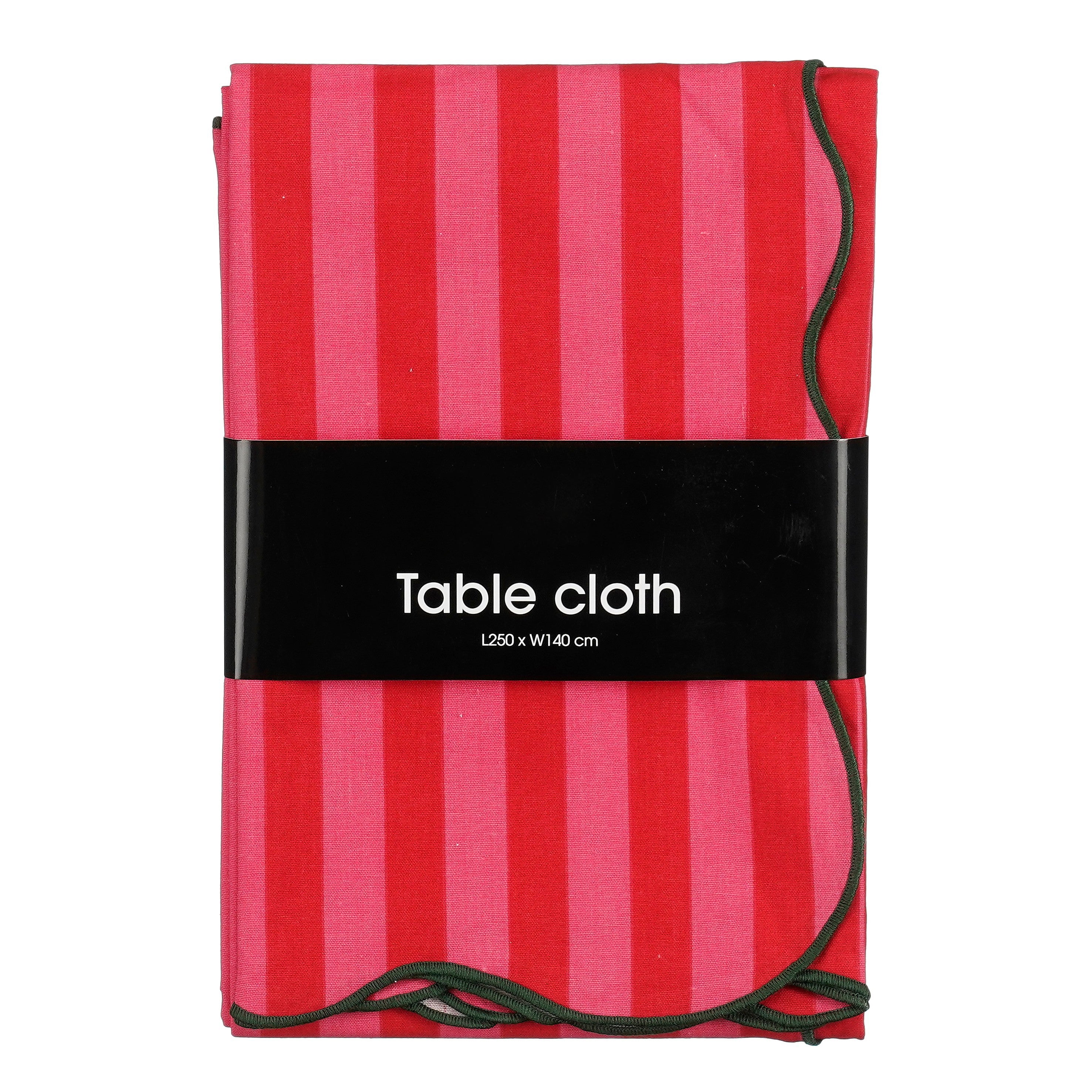 tovaglia a righe fucsia e rosso con bordo ondulato verde