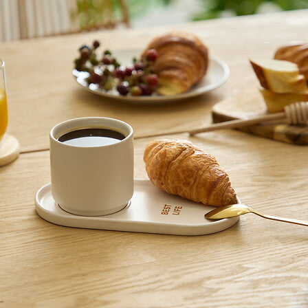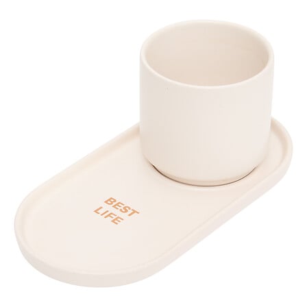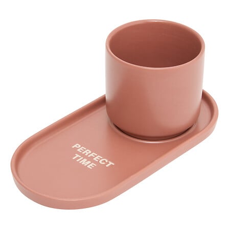 il set comprende: 1 tazza bianca, 1 vassoio bianco, 1 tazza rosa e 1 vassoio rosa
